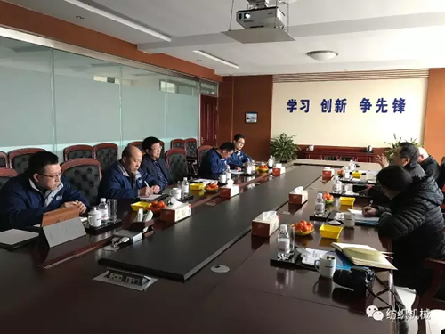 纺机协会总工程师祝宪民(右二)等在企业总工蒋国中(右一)陪同下参观宏发纵横车间。 调研座谈中该公司总经理谈昆伦详细介绍了企业的发展规划。据了解,目前该公司除了加大多轴向高速经编机产品的技术创新,还依托自身的装备技术大力度推进智能工厂建设。据悉,该公司的智能工厂是用于服务企业业务创新的,实现了玻纤及玻纤碳纤混纺织物的低成本,工业化,高效生产。目前,该公司正着手进行全球化布局,并已在美国投建工厂。谈昆伦对于企业的未来发展充满信心,不管是汽车的轻量化,还是风力叶片的高效生产在他看来都将为企业带来更好的发展空间。据悉,该公司已大手笔购入新型汽车复合材料生产线,并同宝马等高端汽车生产商建立紧密沟通,依托自身的装备技术优势和智能化工厂,将快速推进企业在这些领域的业务成长。很多人眼中八纺机最近声音很少,事实上,他们这两年新动作不断,且目标更加明朗、清晰。 22日下午,在同和公司除了调研组一行四人,还来了五位特殊的客人,他们是来自天津工业大学的学者,此次在纺机协会的推动下到同和公司与企业进行信息交流。