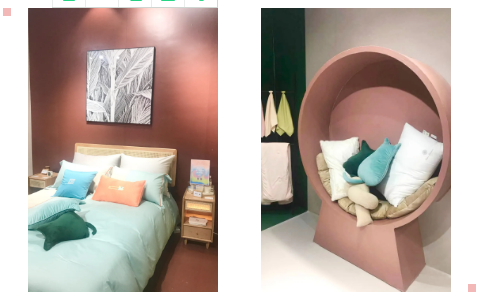 在14.2馆B11 “年轻人的日与夜”主题展区,记者步入卧室这个“夜”空间,被深深吸引住了,整个空间简约清透,清新时尚年轻又有些许俏皮,更具创意的是进门的橱柜里摆满了茶饮包装,杯子里装的可不是奶茶,全是枕套,如此有趣的设计究竟是哪个品牌呢?记者忍不住想一探究竟,当得知是国民老牌家纺南方寝饰时,不禁大吃一惊,好像与印象中的南方寝饰品牌差别很大。
