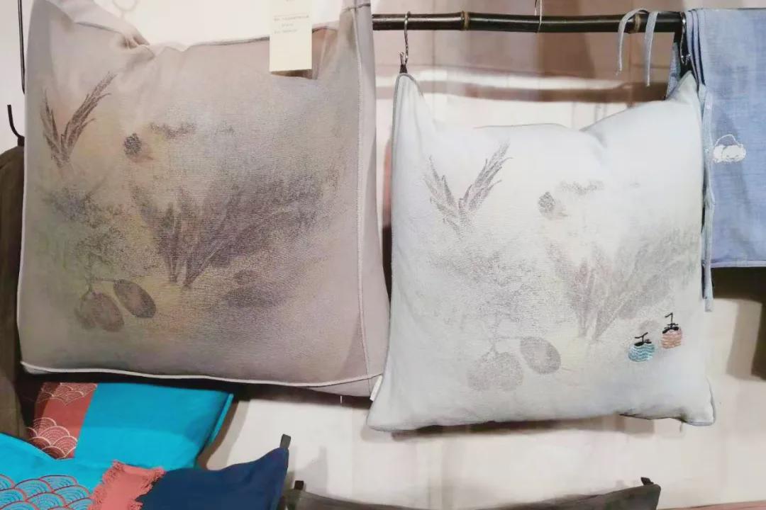 在众多品牌齐聚的展会上想要脱颖而出,一定要有自己独特的风格,南通通州区川姜镇韵织家纺设计工作室展示了系列抱枕、靠包,坐垫、窗帘等产品,充满禅意和韵味,其中【竹林七贤】产品系列,七色一组,用数码印花展现竹林古韵,手绘七位隐士高人,山涛,嵇康,王戎等,系带式外形沉稳大气,充满古意。四边同类色涧线恰到好处的烘托出古韵与现代的结合。