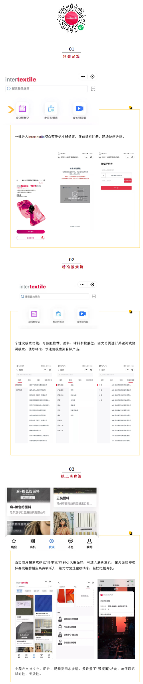 intertextile PLUS小程序将观众预登记、电子会刊、商贸对接、线上沟通、展会资讯、观展导览、展会直播等功能集合于一体,满足您对面辅料采购的所有商贸需求。