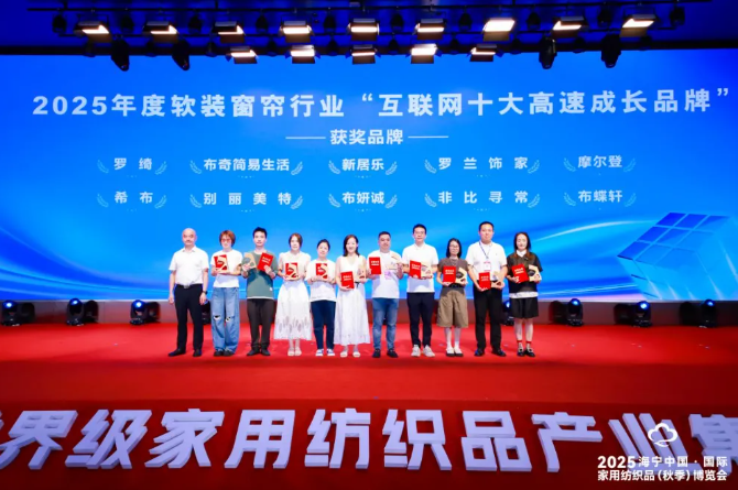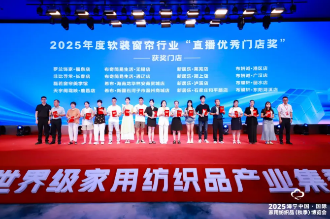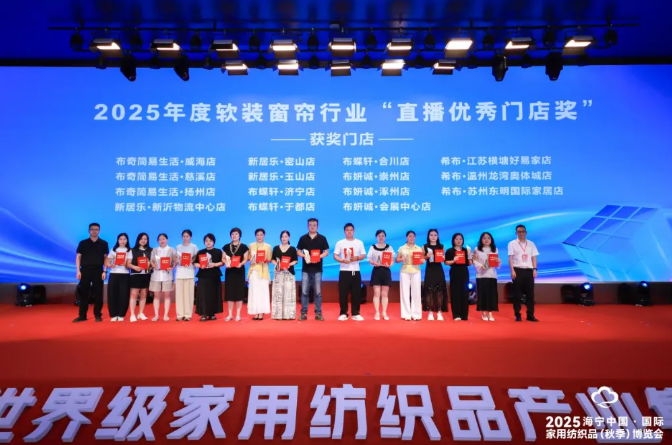 颁奖仪式上,布奇简易生活威海店、新居乐密山店、布蝶轩合川店、希布江苏横塘好易家店、布奇简易生活慈溪店、新居乐玉山店、布妍诚崇州店、希布温州龙湾奥体城店、布奇简易生活扬州店、布蝶轩济宁店、布妍诚涿州店、希布苏州东明国际家居店、新居乐新沂物流中心店、布蝶轩于都店、布妍诚会展中心店、罗兰饰家福泉店、布奇简易生活无锡店、新居乐莱芜店、布妍诚港区店、非比寻常长春店、布奇简易生活通辽店、新居乐颍上店、布妍诚广汉店、磊若窗帘美学馆、希布海南龙华林安商贸城店、新居乐泸溪店、布蝶轩丽水店、天宇阁珑映鹿邑店、希布新疆石河子市温州商城店、新居乐石家庄和平路店、布蝶轩东阳湖溪店等31家门店荣获2025年度软装窗帘行业“直播优秀门店奖”;罗绮、布奇简易生活、新居乐、罗兰饰家、摩尔登、希布、别丽美特、布妍诚、非比寻常、布蝶轩等10个品牌荣获2025年度软装窗帘行业“互联网十大高速成长品牌”;海宁中国家纺城直播基地荣获“2025年度家纺直播孵化优秀赋能机构”。