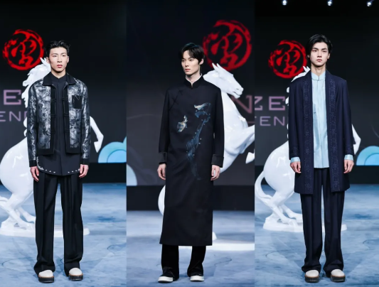 ![]() ![]() ![]() 大秀开场,首套丙午系列高定男装,由曾凤飞品牌设计、定制,作品甄选桐昆丝绒面料,将丙午马年元素与非遗割绒工艺相融,尽显新中装时代风骨。同时,特邀近几季活跃在巴黎、米兰国际时装周的超模薛景伦开场演绎。设计师与超模以各自的艺术语言,完成了对纤维面料的时尚表达。