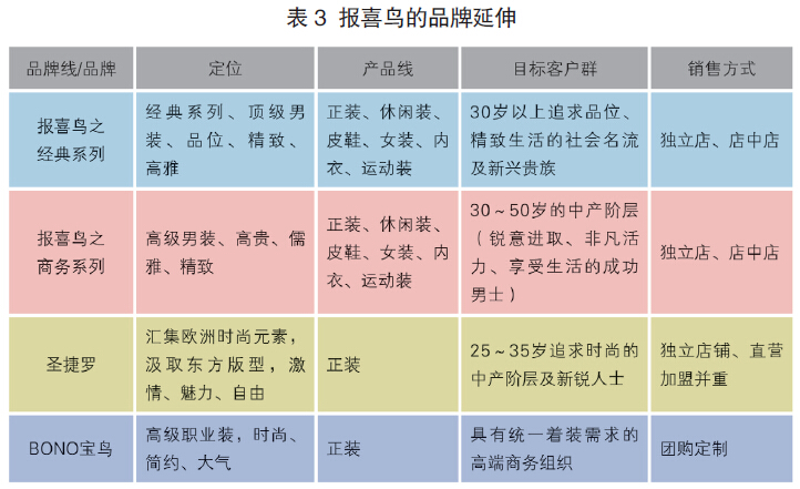 报喜鸟男装也采用了品牌延伸的方式发展多品牌、多系列产品,进一步细分市场。目前公司旗下拥有多个品牌,如报喜鸟主品牌(SAINT ANGELO)、圣捷罗品牌(S.ANGELO)、宝鸟品牌(BONO)、B&Z、HAZZYS等。