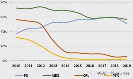 图2:我国涤纶、锦纶上游原料对外依存度历年变化情况
