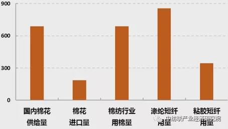图4:2019年我国棉花供需及棉型纤维使用情况(万吨)