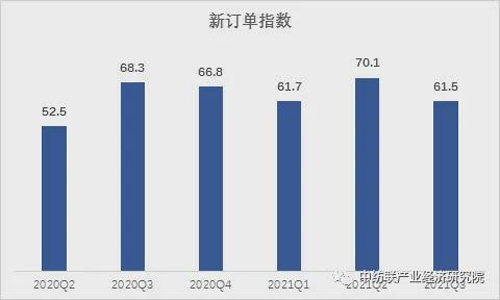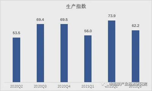 据测算,2021年三季度纺织行业生产指数为62.2,较二季度生产指数73.9的高位有所回调,但生产整体仍处于扩张区间。