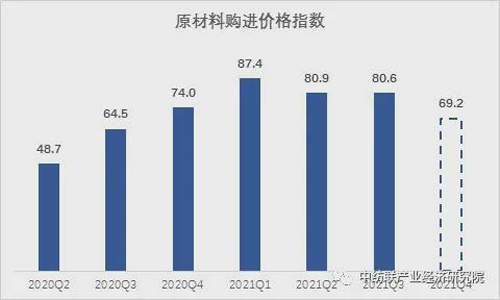 据测算,2021年三季度我国纺织行业原材料购进价格指数80.6,,比上期价格指数仅回落0.3个百分点,原料价格维持高位运行,对纺织企业经营压力仍大。但从对四季度预期看,价格有下降趋势,原材料价格指数或降到69.2。