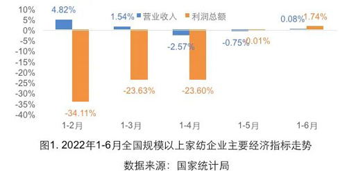 自今年年初以来,由于原料成本压力,国内疫情多点蔓延造成的物流压力加之企业订单受限等原因,行业效益出现大幅回落。5月份以后,随着国内疫情防控形势向好、国家一揽子稳增长政策措施逐渐见效,家纺行业运行得到逐步恢复。据国家统计局数据测算,上半年全国规模以上家纺企业营业收入同比略增0.08%,利润同比从年初的-34%逐渐收窄,1-6月同比略增1.74%。