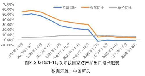 2022年以来,我国家纺产品出口额增速整体呈收窄趋势。据海关总署数据显示, 1-6月我国出口家纺产品226.68亿美元,同比增长3.48%,其中出口数量同比下降2.55%;出口单价同比增长6.18%。整体呈现出口额增速放缓,出口数量同比由正转负,出口单价同比维持高位的局面。