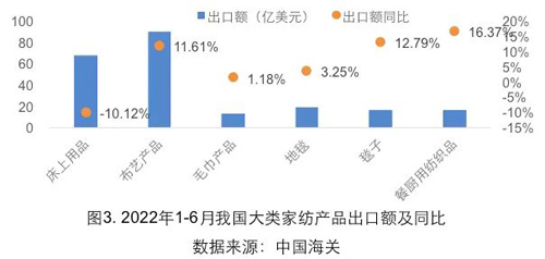 从主要出口的六大类家纺产品来看,除床上用品出口额同比下降外,其他各类家纺产品出口额均保持正增长。