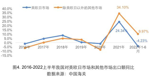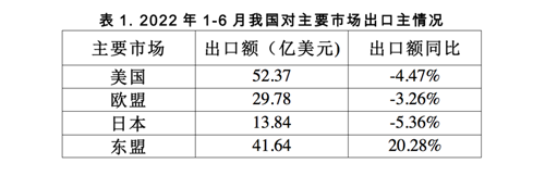 从主要出口市场看,美、欧、日传统市场增速低于其他市场。今年1-6月,我国对美欧日市场出口家纺产品95.98亿美元,同比下降4.23%,对其他市场出口家纺产品130.7亿美元,同比增长9.97%。