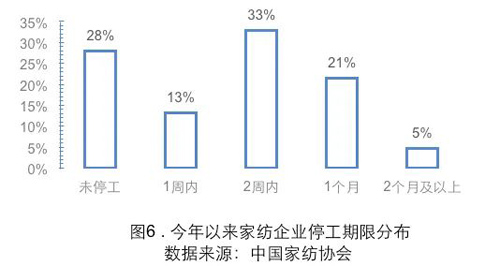 家纺企业普遍认为市场订单减少是其面临困境的首要问题,尤其对于中小型企业更为明显。今年上半年由于国内疫情多点爆发封控,家纺行业企业存在区域阶段性停工现象。据中国家纺协会开展的“企业生产经营与面临问题的问卷调查”结果显示,停工在两周到一个月范围内家纺企业比重较高,占比达54%。企业停工的主要因素为疫情封控,订单不足、原材料供应不足。同时,“疫情波动影响生产生活”也是受访企业反映内销遇到的主要问题。