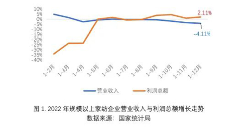 2022年,受到市场需求不足、国内疫情散发频发等因素影响,家纺行业产销规模较上年同比有所收缩。据国家统计局数据测算,规模以上家纺企业营业收入同比下降4.11%。行业技术改造转型升级和成本控制初见成效,全年规模以上家纺企业营业成本和期间费用大幅减少,利润保持了2.11%的小幅增长,行业总体承压缓进,行业质效逐步改善。