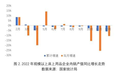 从出口情况看,2022年我国出口床上用品135.47亿美元,同比下降15.46%。其中美、欧、日传统市场下降明显,东盟市场仍保持较高水平增长。从内销情况看,床上用品受国内疫情影响,市场消费动力总体偏弱,传统销售旺季营业额较上年下滑较为明显。国家统计局统计的1095家床上用品企业2022年内销产值同比下降6.02%。
