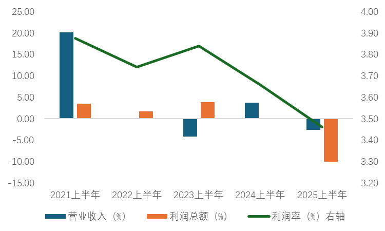 布艺行业近年来下行压力较大。规模以上企业2025年上半年营业收入同比下降19.28%,自疫情后布艺行业增速明显回落,利润总额同比大幅下降46%,利润率近三年也呈现逐渐下降趋势。布艺产品多为半成品面料加工,传统跑量的营销模式由于成本的逐渐攀升和市场结构的变化需要相应调整与升级。