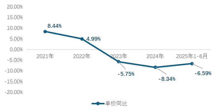 图7.2021-2025年上半年我国家用纺织品出口单价同比走势