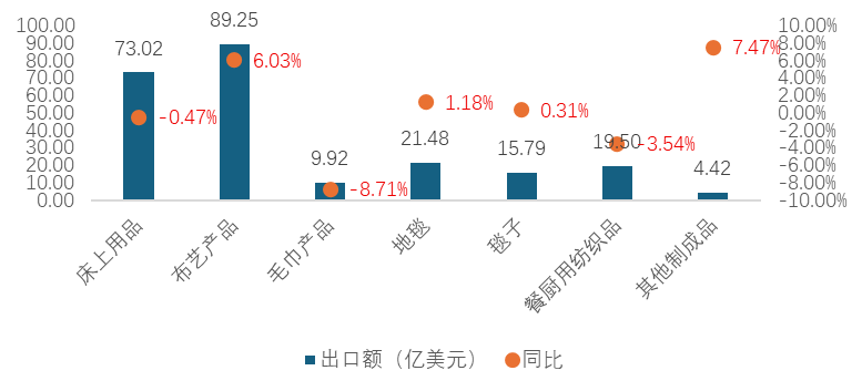 从出口产品情况看,2025年上半年,除床上用品出口额同比略降0.47%外,布艺、地毯、毯子均实现增长,增幅分别为6.03%、1.18%和0.31%,总体保持稳定。