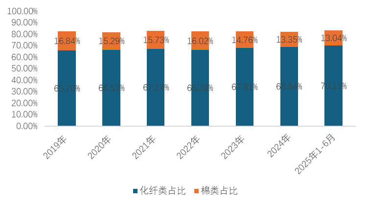 棉制品出口走弱而化纤走强趋势持续。2025年上半年,我国出口化纤类家用纺织品163.63亿美元,同比增长3.82%,占出口总额的70.11%;而棉类家用纺织品出口30.44亿美元,同比下降4.15%,占出口总额的13.04%。近年来,化纤类家用纺织品的出口占比逐渐扩大,较2019年水平扩大了4.41个百分点;棉类家用纺织品占比逐渐收窄,较2019年收窄了3.8个百分点。