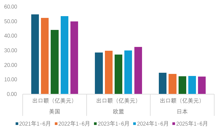 图11. 2025年1-6月我国家用纺织品对美、欧、日市场与历年同期出口情况