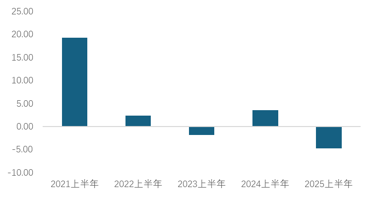 图12.家用纺织品规模以上企业内销2025年上半年与历年同期增速(%)
