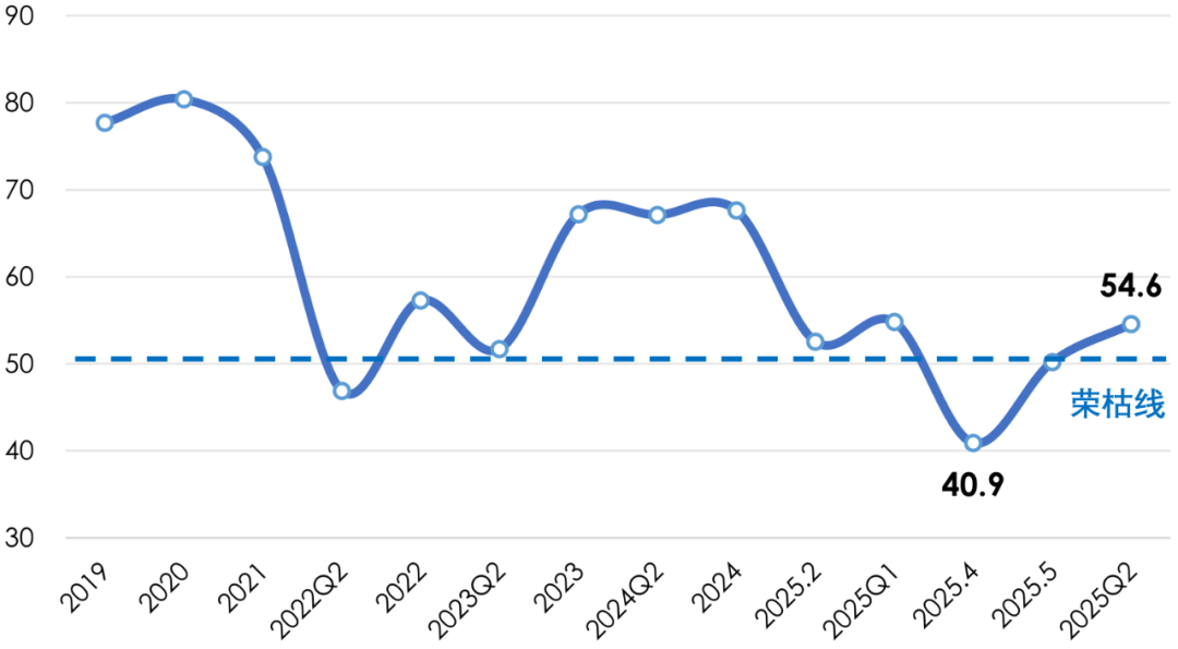 2025年上半年,世界经济复苏乏力,单边主义、保护主义加剧,多边主义、自由贸易受到严峻挑战;国内经济运行总体平稳、稳中向好,在复杂多变的国内外环境中展现了强大的韧性和活力。我国产业用纺织品行业克服了国内外多重不利因素影响,保持了稳中有进的态势。根据协会调研,2025年上半年我国产业用纺织品行业的景气指数为54.6,处于微景气区间(图1)。