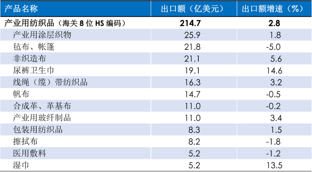 分产品来看,产业用涂层织物是行业出口金额最大的产品,出口额达到25.9亿美元,同比增长1.8%;毡布/帐篷的出口额为21.8亿美元,同比下降5%;非织造布及其制品的海外需求整体保持稳定,非织造布卷材的出口额为21.1亿美元,同比增长5.6%,一次性卫生用品(尿裤、卫生巾等)和湿巾的出口额分别达到19.1亿美元和5.2亿美元,分别同比增长14.6%和13.5%,擦拭布(不含湿巾)和医用敷料的出口额分别为8.2亿美元和5.2亿美元,分别同比下降1.8%和1.2%;传统产品中,线绳(缆)带纺织品、产业用玻纤制品、包装用纺织品的出口有不同程度的增长,帆布和革基布的出口额增速小幅下降。