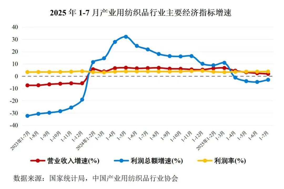 经济效益方面,根据国家统计局数据,1-7月产业用纺织品行业规模以上企业的营业收入同比增长1.9%,利润总额同比下降2.9%;营业利润率为3.8%,同比下降0.2个百分点。行业企业利润仍处于下降区间,但降幅有所收窄。