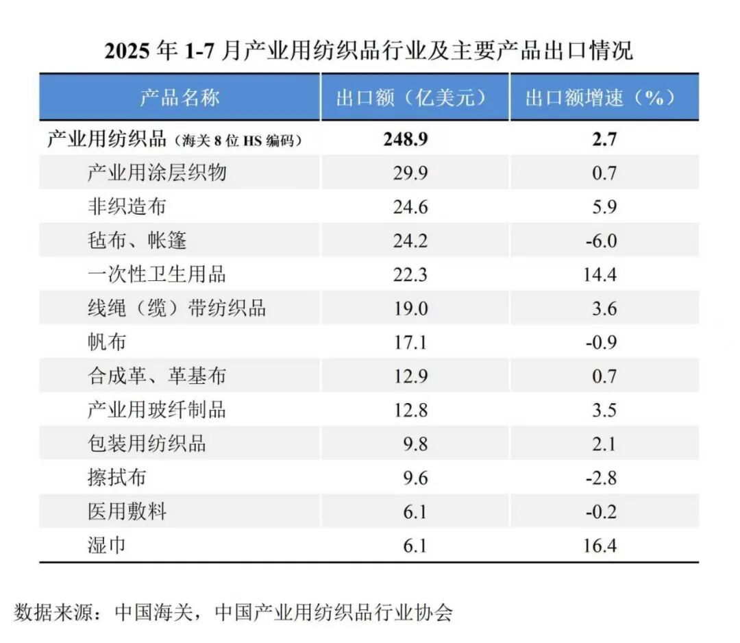 国际贸易方面,根据中国海关数据(海关8位HS编码统计数据),2025年1-7月我国产业用纺织品行业的出口额为248.9亿美元,同比增长2.7%;行业进口额为31.4亿美元,同比增长3.8%。