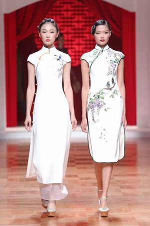 这一系列作品结合西式立体剪裁技术,改变了传统的平直造型,色彩也更为淡雅,以黑、白、灰、粉为主基调,点缀水蓝、湖绿、朱红。