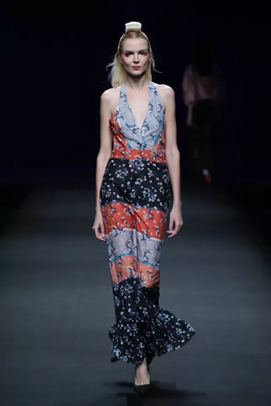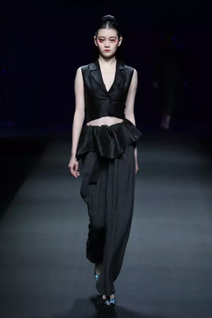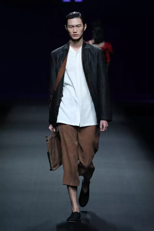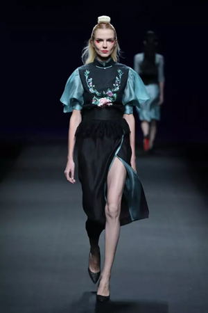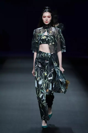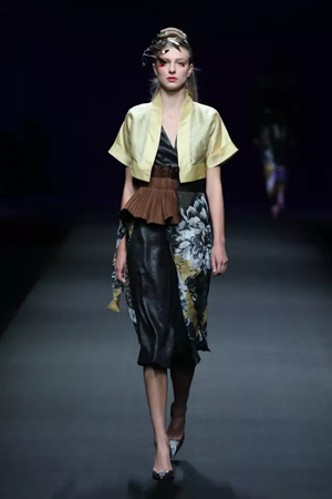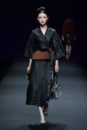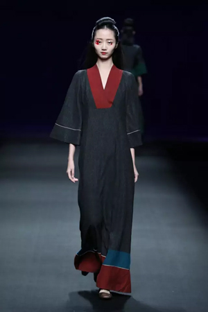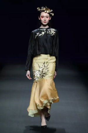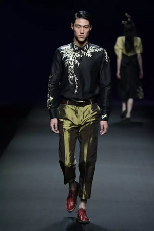 黑色与金色面料,一些汉服元素,时尚的流行色点缀,让“国家级非物质文化遗产”香云纱绽放在T台;豹纹裤和波西米亚花裙增添了活力,特别让人印象深刻的是满台精致的苗绣,竹叶和花蝶,配着靛蓝、赭石、枣红、石青的布料,隔多远都能感受到绣工的朴质精美;更不用说满场流动的那香云纱的质感:沉沉的分量,只属于丝绸的闪烁光芒,好品位的代表。金憓给香云纱带来了时尚感和年轻的活力。