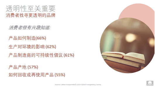 根据美国棉花公司2019全球透明性调查,88%的中国消费者认为服装品牌开诚布公的和消费者就他们对环境的影响非常重要,仅13%的消费者相信服装行业做的很好,让消费者知道品牌对环境的影响。消费者找寻更透明的品牌,消费者很有兴趣知道,产品如何制造(66%),生产对环境的影响(62%),产品制造商的可持续倡议(61%),产品产地(57%),如何回收或再使用产品(55%)。关于产品回收,自2006年起,美国棉花公司发起BLUE JEANS GO GREEN?项目,通过该项目收集牛仔布,将其从垃圾填埋场转移,并与Bonded Logic,Inc.合作,将其回收为UltraTouch?牛仔绝缘材料。每年,这些绝缘材料被分发到美国各地以帮助建筑工作。至今,已经收集了近250万条牛仔裤,从垃圾填埋场转移了超过1230吨纺织废品。