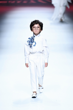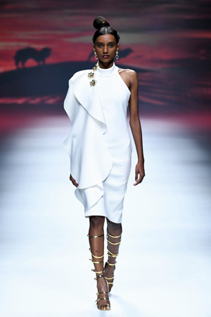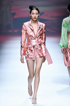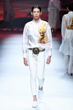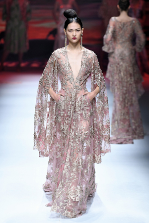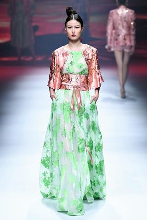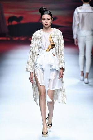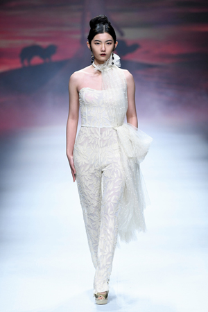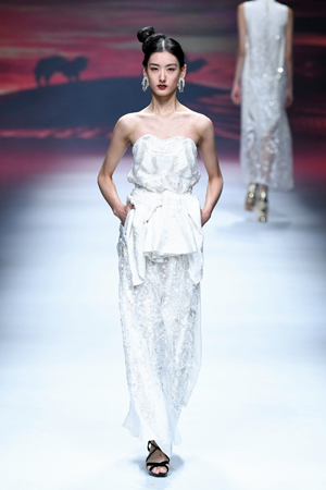古丝绸之路起点古都的文化场景点亮秀场,模特们身穿特质面料的性感长裙款款走来,整体色彩以绚丽丰富为主调,金色与白色系相互贯通穿插;由Morning dew品牌特别独家定制的配饰,与优雅精美的绣花图案、金色又充满浓烈汉唐风情的妆容成为点睛之笔;以组合满幅刺绣、水溶与特种刺绣为搭配,以匠心独运花型的设计,制作成高级成衣,结合雅致独特的时尚感,注重成衣工艺细节的设计与面料材质花型的完美结合。
