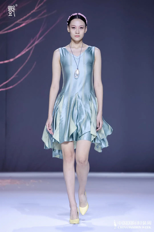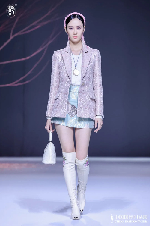 ![]() 走进发布会秀场,盎然春意中有桃花带来的浪漫,粉色的治愈让人在特殊时期身心舒展,自然空灵的乐音流水似的浸入耳膜,大自然的安抚“破壁”而来。本季色调以粉红、青绿和雪山白为主,所有服饰的颜色都能从大自然中找寻来源,从视觉上直接拉近与自然的距离,这也是邓兆萍本人热爱旅行、纵情山水的显性风格。面料采用可持续发展再生纤维与高科材料交织而成,科技助力让服饰在低碳可持续的前提下,还能够超能满足“保暖、阻燃、抑菌、轻薄”的需求。与盛泽恒信织造共同合作开发的,“轶纶95”聚酰亚胺纤维与可持续性醋酸纤维相结合新面料,被邓兆萍骄傲得称为“漂亮的轶纶黄”。细节上,设计师将人文风情、民族文化以独特的艺术思维融入非遗创新制法中去,比如腰间传统盘扣工艺饰品的点缀、民族元素的提花以及仿照冰川色彩完成的,明暗过度细腻的面料,因为达利丝绸的支持而得以娓娓道来的设计巧思一起构成了这个系列的亮点。