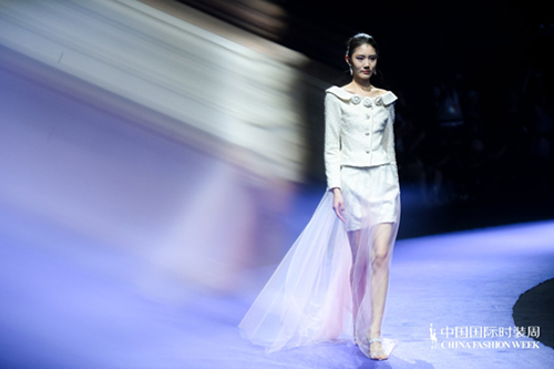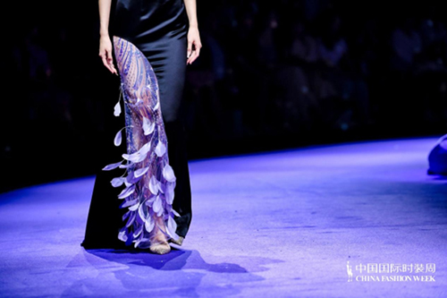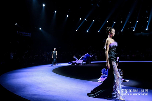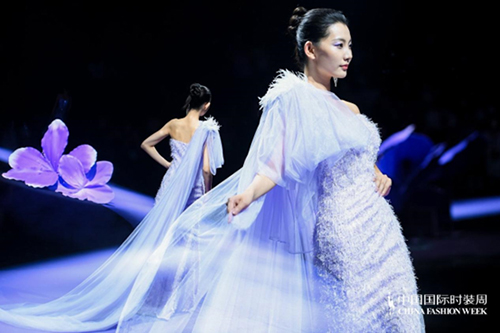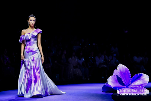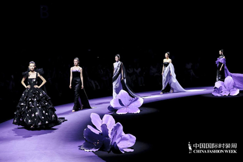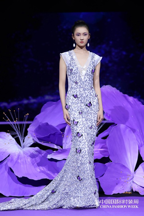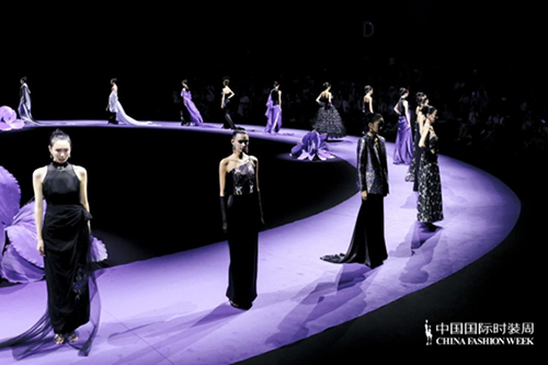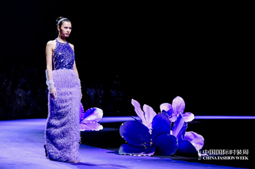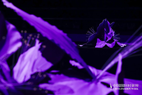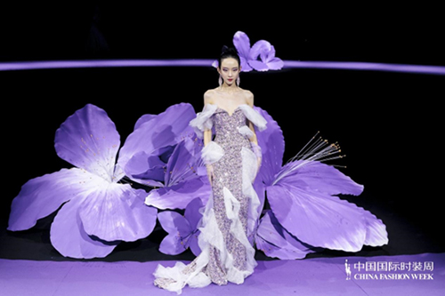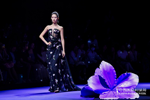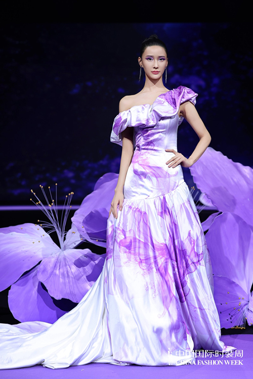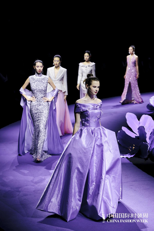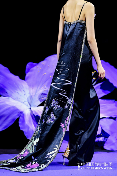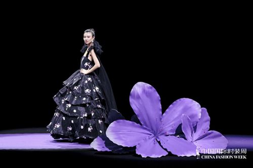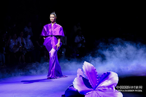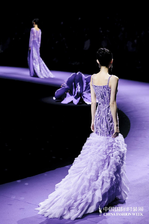 ![]() 步入秀场,观众仿佛坠入一个被施以魔法的东方花园。舞台以品牌标志性的紫荆花为灵魂装置,延续经典紫色基调,营造出花团锦簇、蝶舞莺啼的梦幻之境。这不仅是品牌十周年的鎏金献礼,更是创始人关淑敏以十年以针线作笔、以丝绸为墨,写给东方美学的千行长诗。