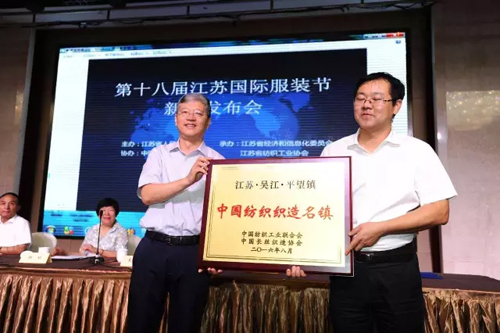 王志忠在新闻发布会上指出:纺织服装行业是江苏国民经济传统支柱产业和重要民生产业,也是国际竞争优势明显的产业。江苏省纺织服装产业无论是数量还是层次上均居全国前列。规模总量全国领先,利润总额全国最高,外贸出口总体平稳,产业集群实力雄厚。今年上半年,江苏纺织服装行业实现主营业务收入7148.84亿元,同比增长5.16%;全行业实现利润总额370.7亿元,同比增长8.38%,继续保持了健康稳定的态势。 他表示,江苏国际服装节是江苏省政府重点打造的会展品牌之一,是专门为江苏省内外纺织服装行业打造的交流、展示和服务的平台。今年,服装节已经走进第十八个年头了。十八年来,江苏国际服装节紧扣当前行业发展形势,年年有亮点、届届有创新,在推动行业发展、加快自主品牌和集群品牌建设、提升江苏时尚地位、扩大区域影响力等方面作出了突出贡献。 产业集群再添喜 平望镇、盐城市等获授牌表彰 在行业盛事江苏国际服装节即将举办之际,江苏纺织服装产业集群再添喜。在此次新闻发布会期间,举行了产业集群试点单位的授牌仪式。