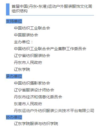 丹东是辽宁省纺织服装行业重要产区,2016年丹东东港市在辽宁省纺织服装协会的推荐下,被中国纺织工业联合会、中国服装协会授予了“中国运动户外服装名城”称号。为了更好地宣传推广丹东东港市运动户外产业集群崭新的区域品牌形象,5月7日至9日,由中国纺织工业联合会、中国服装协会支持,中国纺织工业联合会产业集群工作委员会、辽宁省纺织服装协会、丹东市人民政府、辽东学院联合主办,中国纺织摄影家协会、辽宁省服装设计师协会、丹东市经济和信息化委员会、东港市人民政府、丹东运动户外纺织服装公共技术平台有限公司联合承办的“首届中国(丹东·东港)运动户外服装服饰文化周”活动,将盛装亮相。 本次文化周的主题是 “健康时尚 绿色动能”。文化周通过高峰论坛、流行趋势发布会、产业集群产能对接会、产业联盟成立大会、体验中心揭牌仪式、校企合作成果展示等主要活动,向国内外推介丹东东港市运动户外纺织服装产业集群、展示制造技术水平,加强与全国产业集群的对接交流与合作,使丹东东港市成为全国纺织服装行业产业转移的承接地、企业及品牌产能转移的共赢地、产业链上下游协同发展的合作地。