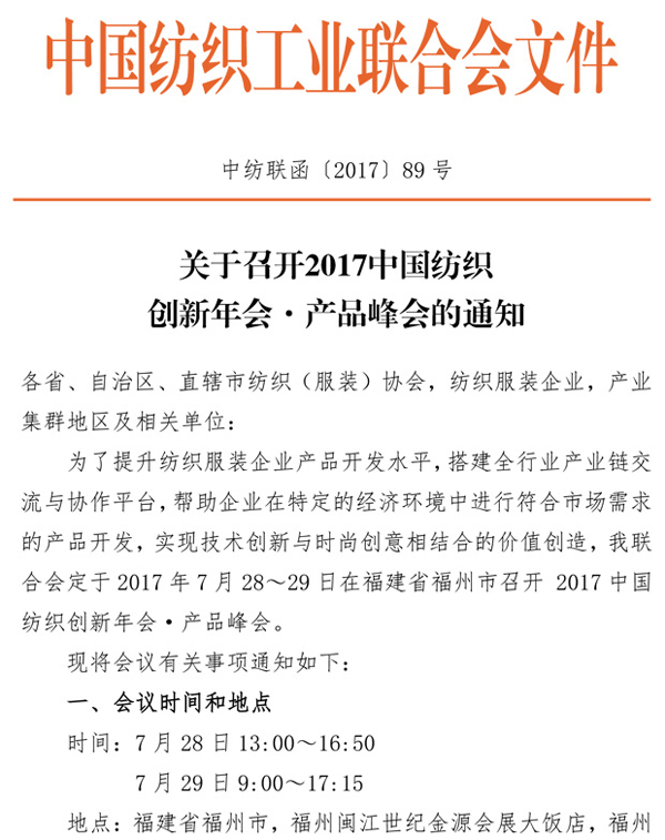 关于召开2017中国纺织创新年会·产品峰会的通知