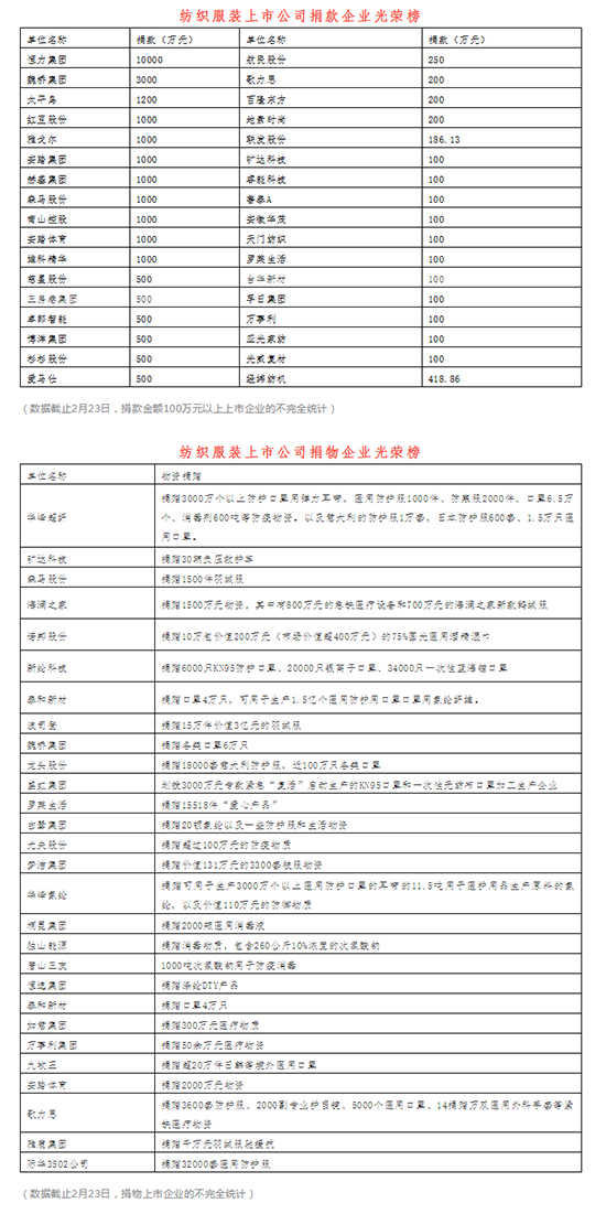 俞亦政 郝杰/文 疫情防控正处在最吃劲的关键阶段,一面要继续毫不放松地抓紧各项防控工作,一面要有序恢复生产。作为我国纺织行业创新优势企业的集中代表和产业发展的排头兵,纺织上市公司积极响应中央号召,主动作为,在这场没有硝烟的抗击新冠病毒战役中,奋力进行“双线作战”,抗疫生产两不误,全力以赴地筹款捐物,并根据抗疫一线需要,紧急安排投资新增(扩建)纺织防护用品产能,在做好防控工作的前提下,全力推动复工复产,充分展现了纺织上市公司责任担当与能力支撑。 人们不会忘记,在过去的2019年,受中美贸易摩擦影响,纺织业出口持续承压,全年出口额同比负增长,很多企业为此遭受损失。在这种情况下,广大纺织企业不忘初心,第一时间挺身而出,尽最大力量捐款捐物,以最快速度投资扩产,支持国家抗疫。同时,广大纺织企业不怨天尤人,主动作为,力争把疫情给企业带来的影响降到最低,纺织人心中最清楚:平稳健康发展本身就是对国家就业和税收做出的重大贡献。纺织业在疫情中的担当表现无愧于国民经济支柱产业和重要民生产业的地位,纺织上市公司则是行业的优秀代表。 捐款捐物,奉献爱心 目前我国境内纺织服装类上市公司超过400家(沪深两市、港股以及新三板股转系统)。据中国纺织规划研究会对80多家上市公司的初步调查和不完全统计,截至到2020年2月23日,80多家纺织服装类上市公司(及所属子公司或所在集团公司)捐款总额已超2.76亿元,捐赠各类抗疫物资(口罩、防护服、护目镜、一次性医用手套、卫生消毒液、床上用品、御寒衣物等)估算价值超4.6亿元。 随着科学防控精准施策的进一步落实,目前纺织服装上市公司各类捐赠活动还在继续。一份份爱心犹如涓涓细流,汇聚成了中国抗“疫”的强大力量。 针对此次新冠肺炎疫情,恒力集团于1月27日向武汉市慈善总会捐赠1亿元人民币,专门用于武汉疫区新型冠状病毒肺炎防治工作。 魏桥集团捐款3000万元,紧急组织生产6万只口罩,捐赠防疫一线,并安排旗下的山东向尚服饰文化有限公司于2月10日紧急转产防护服和隔离衣,全力支持抗疫一线。 李宁集团在了解到疫情防控需求后,李宁湖北分公司即时向湖北荆门市红十字会捐赠100万元以及部分一线亟需的医疗物资。与此同时,李宁集团通过中华慈善总会追加捐款1000万元,用于支持新型冠状病毒感染肺炎疫情的防控工作。 为缓解疫情防控物资紧缺状况,早在2月1日,红豆股份就将服装生产线转变为防疫工作需要的防护服生产线,2月7日达到日产一般防护服1万件,开足马力生产支援武汉防控一线。并发出公告,生产产品将服从政府统一调拨,不对外进行销售。 东方国际集团全球调集60万只口罩和25万套防护服在第一时间紧急支援抗疫防疫一线。并协调组织龙头股份三枪团队紧急采购近100万只口罩。 雅戈尔定向捐款1000万元,用于宁波市医务、救援人员和患者,助力疫情的治疗和防控。 安踏集团积极响应,迅疾调配资源,于1月25日作为首批捐资企业向中华慈善总会捐赠人民币1000万元。 森马集团捐赠1000万元和1500件羽绒服支援各地共同抗击新型冠状肺炎疫情。 海澜之家特向湖北武汉捐赠价值1500万元的物资,医疗设备定向捐赠给雷神山医院,用于医疗救助;鹅绒服捐赠给武汉抗击疫情的医护人员。 波司登及时捐出15万件价值3亿元的羽绒服直送一线,解决春节期间武汉地区遭遇断崖式降温的“倒春寒”。 歌力思在捐赠200万元善款的同时,通过海内外资源购置3600套防护服、2000副专业护目镜、5000个医用口罩、14万双医用外科手套等紧缺医疗物资在第一时间支援到深圳二院和深圳三院的抗疫前线。 …… 这些企业是纺织服装上市公司的集中代表,彰显了纺织服装上市公司作为行业领军先锋和中坚力量的社会责任与担当。