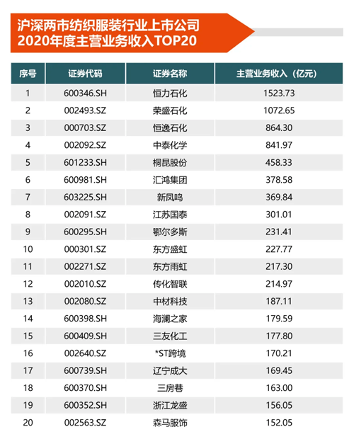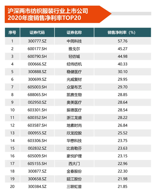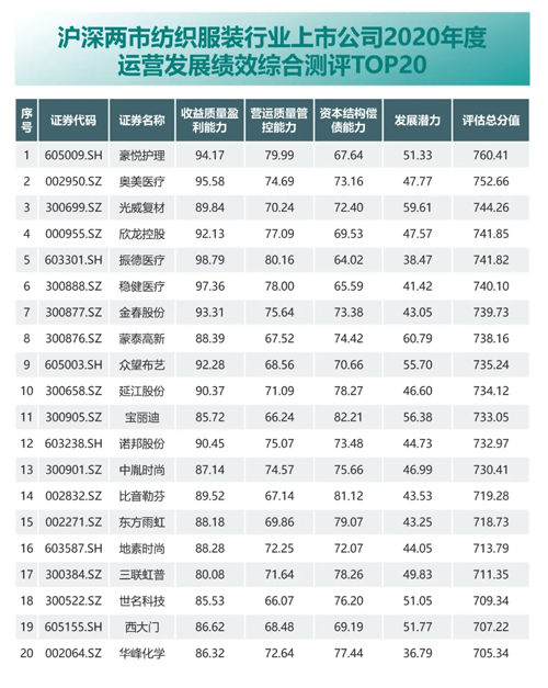 年会发布了“沪深两市纺织上市公司2020年度运营发展绩效综合测评前20排名TOP20”,“沪深两市纺织上市公司2020年度市值、营收、净资产收益率、净利润、销售净利率排名TOP20”名单。(名单如下)
