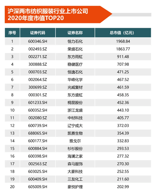 截至2020年末,沪深两市纺织上市公司市值规模总量约19658.78亿元,较2019年末市值总规模增长了40.67%,年度增速提高了11.19百分点。市值排名前三位公司是恒力石化、荣盛石化、东方雨虹,市值分别为1968.84亿元、1863.77亿元和911.48亿元。
