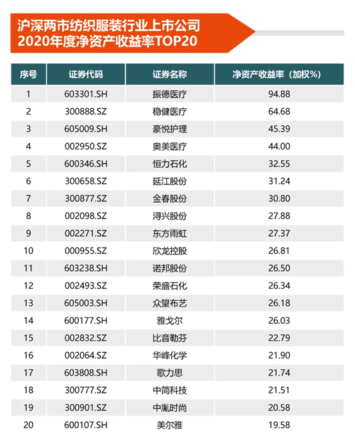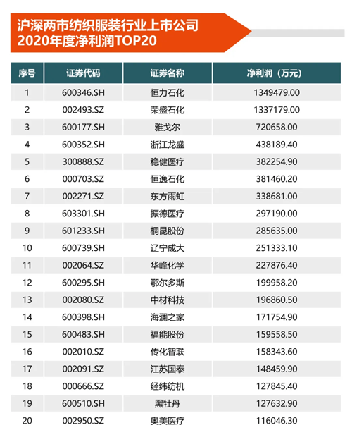 净利润排名靠前5位的恒力石化、荣盛石化、雅戈尔、浙江龙盛、稳健医疗5家上市公司,净利润合计422.78亿元,占沪深两市纺织上市公司净利润总额的56.05%。
