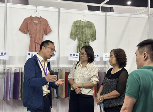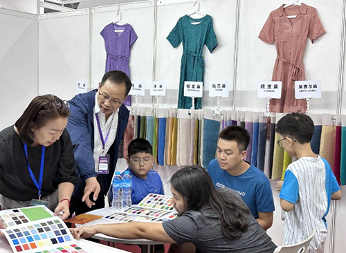 绍兴柯桥渡深纺织有限公司已经是第二次参加缅甸纺织展,对于缅甸的纺织市场非常熟悉。公司早几年就在缅甸设立了办事处,雇佣了缅甸当地的员工,建立起了贸易前哨站,所以渡深的摊位上客户可谓是络绎不绝,对当地市场的深耕,终得到回报,参展负责人王总表示,本次参展意向成交额200万美金。