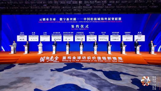 大会现场举行了《2026世界纺织行业趋势展望》发布仪式,“柯桥优选”品牌推广发布仪式、纺织产业AI大模型——“AI布”2.0发布仪式,以及云链布全球、数字新丝路——中国轻纺城海外展贸联盟启动及签约仪式,为全球纺织协同创新提供“柯桥方案”。