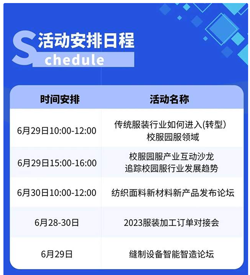本次博览会涵盖「缝制设备展、印花工业展、面辅料及纱线展、职业装团服展、校服园服展、服装供应链及制帽展、皮革鞋机鞋材展」七大主题,展览面积逾7万㎡,展出国内外1500余家知名品牌,携全行业的展品和新技术,在展会配套活动方面,既有传统的服装订单对接会、数码印花解决方案研讨会等活动,又有创新校服园服设计大赛、传统服装行业转型、纺织面料新材料、智能智造论坛等产业升级等活动,助力纺织服装制鞋全产业链融合升级。