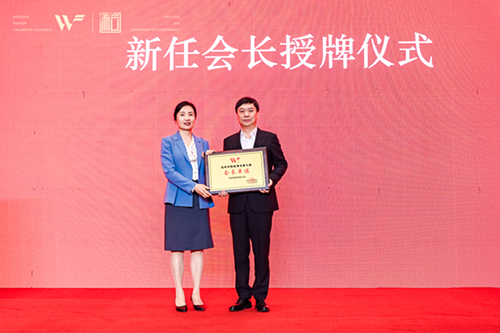 ![]() 大会上,东蒙集团有限公司董事长池慧杰连任第九届温州市服装商会会长(右)