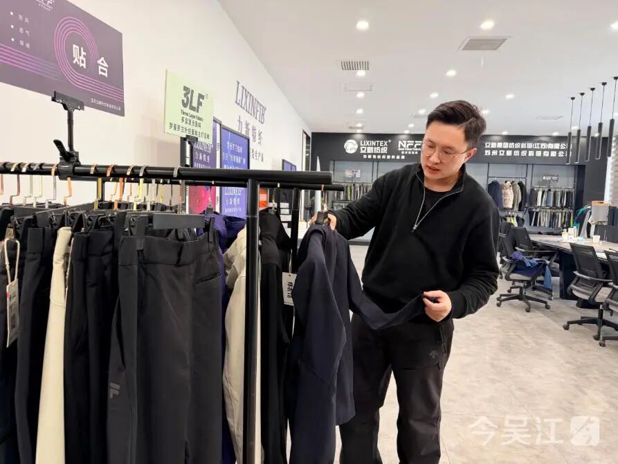 ![]() “这款经编横条三层复合布,兼具防水、防风与透湿功能,底布柔软亲肤,还自带发热属性。”在公司展厅,产品总监施冠杰向记者介绍受到客户青睐的3LF针织面料服饰。江苏罗曼罗兰新纤维针织有限公司(以下简称“罗曼罗兰针织”)自2023年创办以来,整合长三角纤维产业优势、后整理技术优势及上海设计创新资源,全力推进品牌建设。