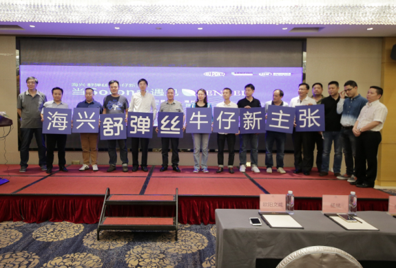 接着,舒弹丝®产品在牛仔产业链的合作企业:前进牛仔布、北江纺织、致兴纺织、致联兴纺织、东信纺织、科纺纺织、联润纺织等企业的领导上台,与主办方领导一起启动海兴的产品宣传语:“海兴舒弹丝,牛仔新主张!”这标志着舒弹丝产品在牛仔领域的新一轮推广正式开始,而舒弹丝®与天丝®的混纺产品无疑也是亮点之一。 紧接着,来自杜邦、兰精、海兴的技术专家分别就Sorona®、TENCEL®以及舒弹丝®产品的特点做了详尽的介绍。Sorona®是一种部分源自植物性原料的新型生物质功能性纺织原料,已获得包括Oeko-Tex®标准 100在内的多项环保认证。并且是最为严格的一类认证。 海兴的舒弹丝®是杜邦Sorona®在牛仔领域的最新应用,面料手感柔软且蓬松,有第二层肌肤的质感;穿着舒适;面料拉伸后具有出色的回复性,让膝盖等部位不再松驰、鼓包,且布面不易起皱;含舒弹丝®面料能经受各种洗水条件,创造丰富的洗水效果; 同时,舒弹丝®还能与棉、粘、麻等各种短纤维混合搭配,给设计师更多创意自由。 兰精的TENCEL®是第三代人造纤维素纤维,最近几年已经在牛仔领域得到广泛应用。TENCEL®给牛仔面料带来的高强力、耐漂洗、悬垂性、布面光泽度、自然弹性,以及穿着舒适感,都越来越得到消费市场的认同。