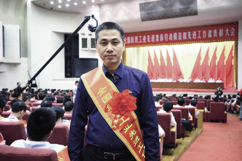 姜正涛 即发集团有限公司纬编工 织布绝技让他收获人生 从20岁入行以来,姜正涛已经在纬编工的岗位上度过了14个年头。他练就了一套织布绝技,通过观察布面瑕疵,能从数千枚织针中判定坏损针的位置,由他织出的布匹废品率仅为其他人的十分之一。 工业化生产让人们觉得一切都有系统的操作,人工技术似乎变得没那么重要了。但事实上,即使有了智能化的制造机械的支持,织布仍是一件不简单的事情。当那些细纱线从四周输入织机内,每台织机有90根纱线,万一有一根纱线断裂,整台织机就会自动停止运转。 姜正涛高超的劳动技能源自平日的工作,也在各项大赛中得到充分展示。2009年,在即墨市第三届职工技能大赛中,他取得了纬编工组第二名的好成绩,被授予即墨市“创新技术能手”荣誉称号;2011年,在山东省针织行业纬编工职业技能大赛暨全国选拔赛中,姜正涛获得总成绩第五名、单项成绩第二名的优异成绩,被授予山东纺织行业“技术能手”荣誉称号;2014年11月参加2014年全国纺织行业“佰源杯”纬编工职业技能竞赛,一举摘得桂冠,被授予全国纺织行业“技术能手”荣誉称号,12月被授予全国 “技术能手”荣誉称号;2015年4月被授予 “山东省纺织工业首席技师”荣誉称号。今年,他又被评选为全国纺织工业劳动模范,这代表着纬编工的最高荣誉,也是记录他职业理想与事业发展的又一座里程碑。