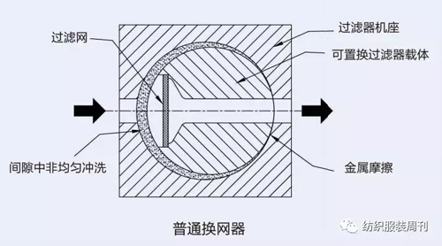 三是以换网器清洁粘性流体。为在聚合物工业中实现可靠的生产工艺,在挤出前从纺丝溶液或熔体中去除杂质是至关重要的。 传统过滤装置(换网器)主要包含一个机座本体,带有杂质流体的进口和被过滤流体的出口,一个在机座内可置换的过滤器载体,一个在过滤器载体内的过滤器。如果过滤网被堵塞则必须被清洁或置换。因此机座中的过滤器载体必须以此方式被置换,譬如,关闭过滤器载体的进口,含过滤器的过滤器载体送到能接受清洗的位置。之后,过滤器载体被再次置换到初始位置。