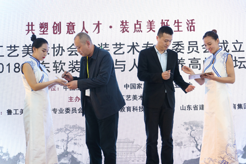 在论坛上的圆桌对话环节,山东城市建设职业学院继续教育处处长顾琦和上海软育教育科技有限公司董事长孙锐、中央美术学院设计学博士山东艺术学院副教授黄兆成、青岛海信房地产研究中心、中国建筑学会室内设计分会室内设计师毛卿、中国手工艺术大师中国青年玉雕艺术家吴醉石等嘉宾共同解析了中国软装饰品行业现状、发展以及未来,深度探讨在互联互通的新时代背景下软装行业发展该何去何从。 在闭幕环节,山东省工艺美术协会会长万进、山东省工艺美术协会软装艺术专业委员会秘书长盛龙为嘉宾颁发聘书。山东省工艺美术协会软装艺术专业委员会主任、山东城市建设职业学院副院长高绍远 致闭幕词,在众多行业大咖的共同努力下,为软装艺术专业委员会下一步工作提供了清晰的思路和解决方案,同时也会持续发挥推动作用,为行业变革创新带来强大的动力。最后,山东软装发展与人才培养高峰论坛圆满闭幕。 消费升级促软装迎来发展期 专委会成立促行业健康发展 习近平总书记在十九大报告中指出,我国社会的主要矛盾已转化为人们日益增长的美好生活需要和发展不平衡之间的矛盾。随着社会物质文化生活水平的提升,人们对生活和家居空间有了更高的要求,软装不仅是生活方式的追求方向,而且能够改善生活品质,逐渐受到消费者的认可。 目前,软装行业正处于发展初期,但在物质和精神高速发展的时代,精神生活的享受越发地讲究,消费者已经对空间环境的美化越加重视,也使得消费者对软装关注度越来越高。软装能够充分满足人们对生活环境美观性、舒适性、环保性、变化性以及独特的个性化需求,将拥有客观的行业市场。 上海软育教育科技有限公司董事长孙锐表示,专委会的成立可以搭建平台,聚合资源,实现三方融合,校企协合作,解决产教融合痛点难点问题,提供制度化和系统化解决方案,发挥统筹协调作用,调动各方参与积极性,对教育链、产业链、人才链的重组,构建“平台对平台、学校+企业”的合作,实现教育和产业并肩“走出去”。据悉,上海软育教育科技公司也在积极筹备软装教育APP平台,将在近期发布上线,国内外大师在线课程、人才输送、师资培训、资源互惠、设计实践、在线订单等等都会实现,着力打造软装综合型平台。中国工艺美术协会秘书长孙烨表示,随着人们消费理念的转变,人们对于美、对于家的定义在不断升级,轻装修重装饰理念深入人心,山东省工艺美术协会软装艺术专业委员会的成立,是行业发展的进步,中国工艺美术协会将充分发挥社会组织职能,资源共享,推广软装艺术,推进工艺美术产业跨界融合,共同开创中国传统工艺美术发展新局面以及软装新方向,为促进行业更快更好发展作出应有的贡献。